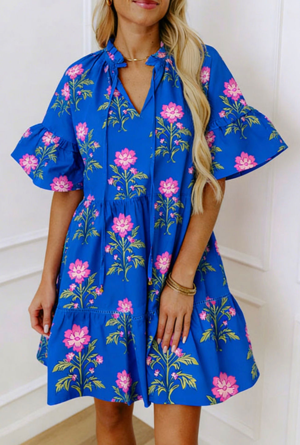 Bright Green Colorblock Puff Sleeve Ruffle Hem Dress